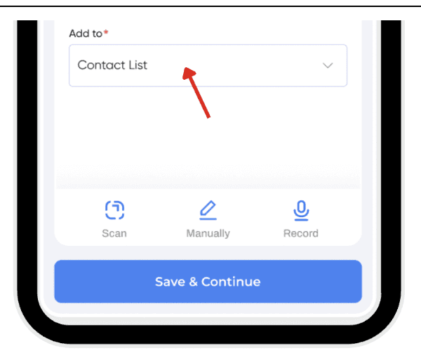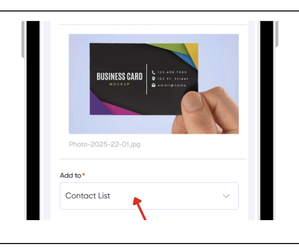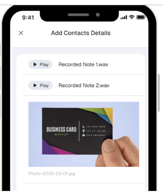 Upload or take a picture of the business card or image into the app. AI scans the card and auto-fills fields of the contact.