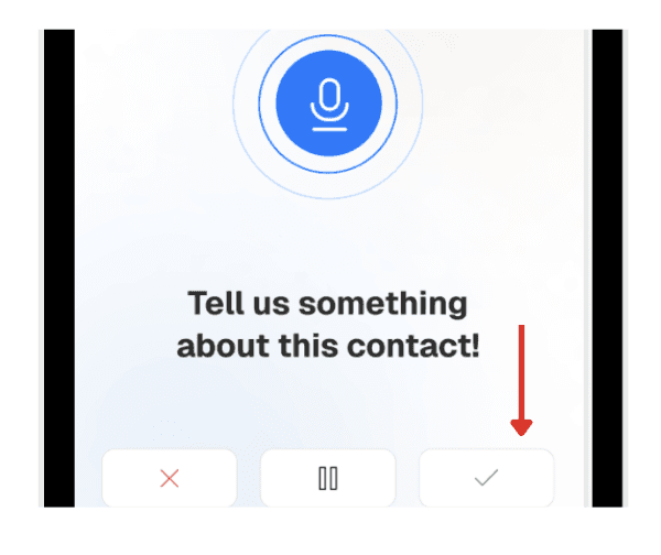 Dictate name, phone, email, and notes; the system converts your speech to text and click the tick icon to confirm.